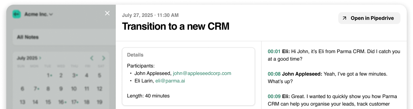 Review & push to your CRM. Approve with one click and we log the note to your CRM. Works with Folk, Pipedrive, HubSpot, and more.
